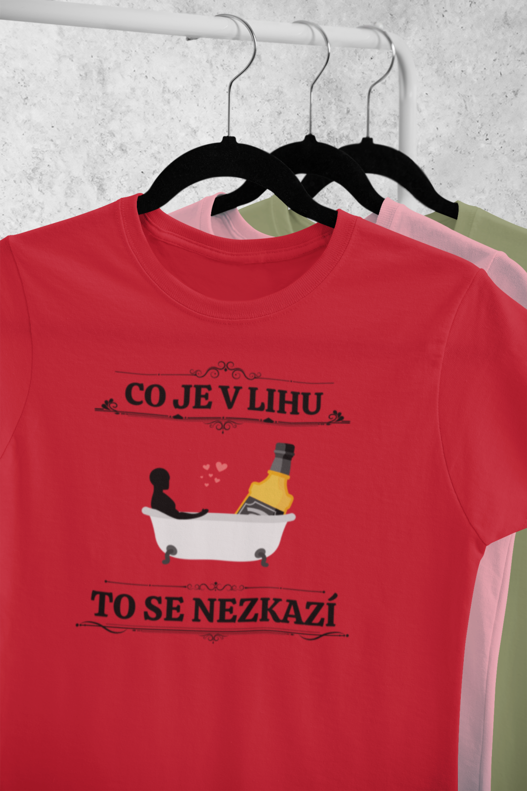 Dámské tričko s kvalitním potiskem Co je v lihu, to se nezkazí